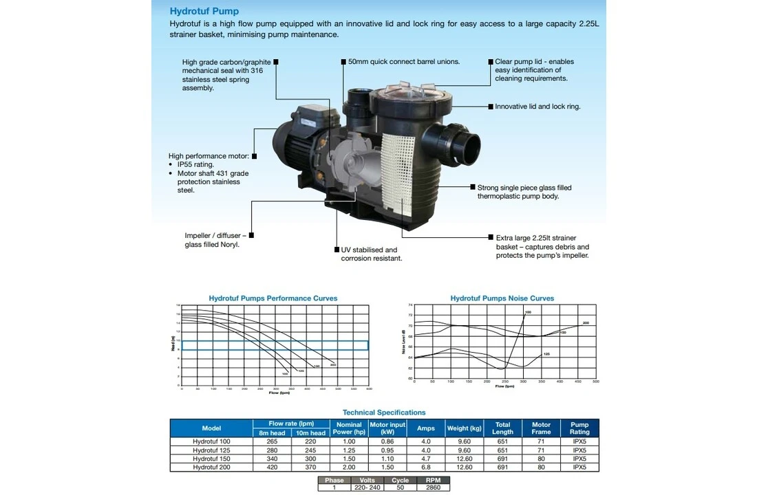 Deze zelfaanzuigende zwembadpomp is een zwaar uitgevoerde, gunstig geprijsde zwembadpomp. Net als alle andere zwembadpompen van Waterco biedt de Hydrotuf de zwembadeigenaar waar voor zijn geld. Waterco is erin geslaagd om een betrouwbare, robuuste zwembadpomp met veel functies op de markt te brengen tegen een scherpe prijs. De functies zijn: